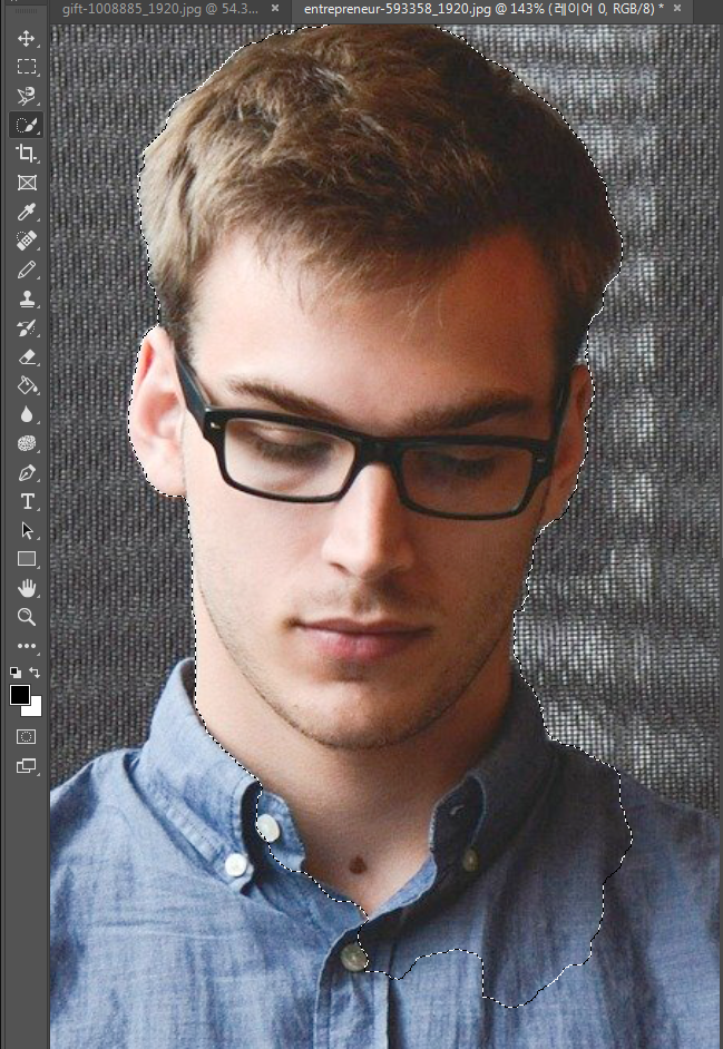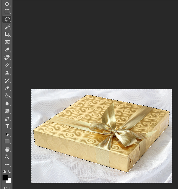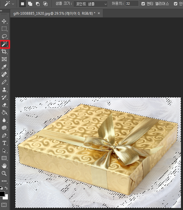아쉽게도 상자가 너무 밝아 배경과 구별을 잘 못하네요. 이 경우에는 올가미로 필요한 부분을 추가 및 제거 해주면 됩니다. 도구 툴 바의 올가미를 선택하거나 L키를 눌러 줍니다. 올가미로 추가 할 영역을 쉬프트(Shift)키를 누른 채 선택하여 주면 원래 선택한 영역에 추가를 해줍니다. 빼야 하는 영역은 알트(Alt)키를 누르고 감아주면 됩니다.
