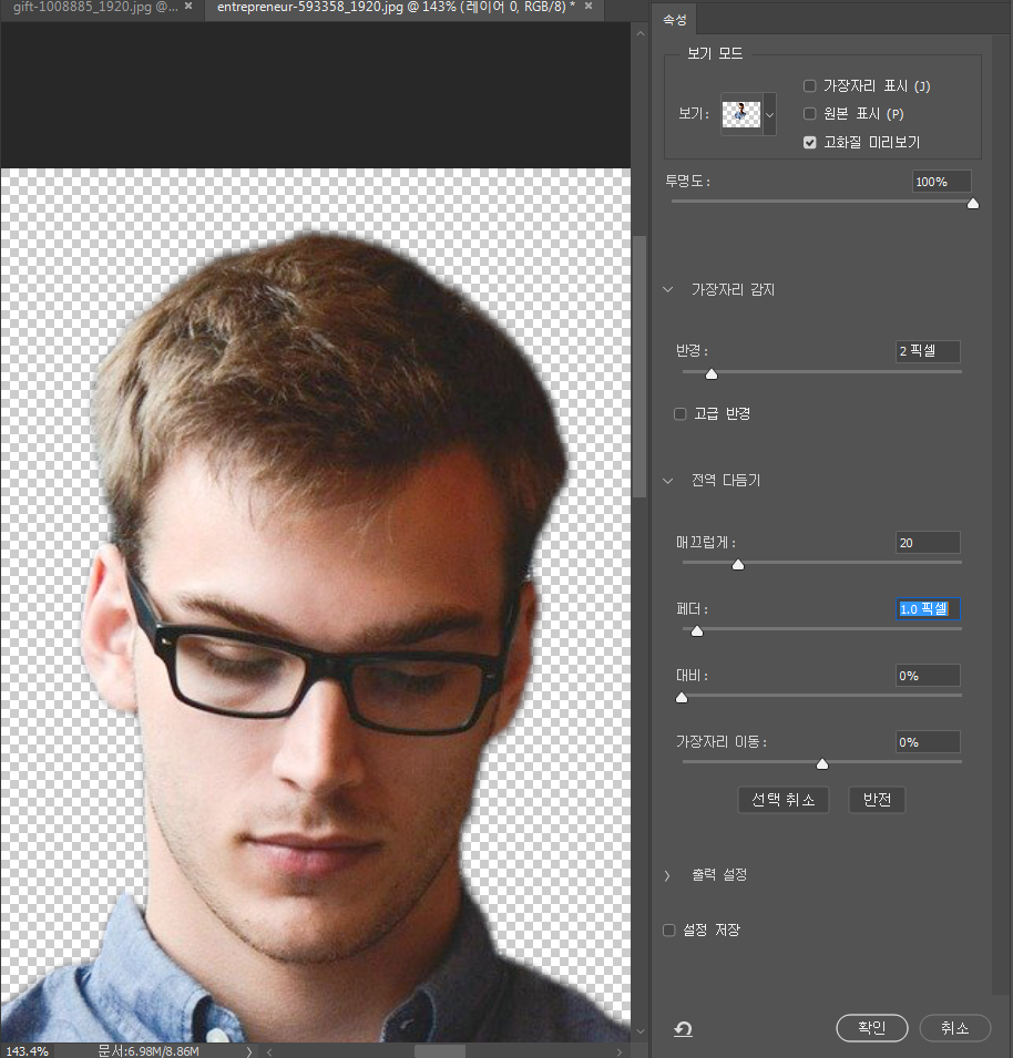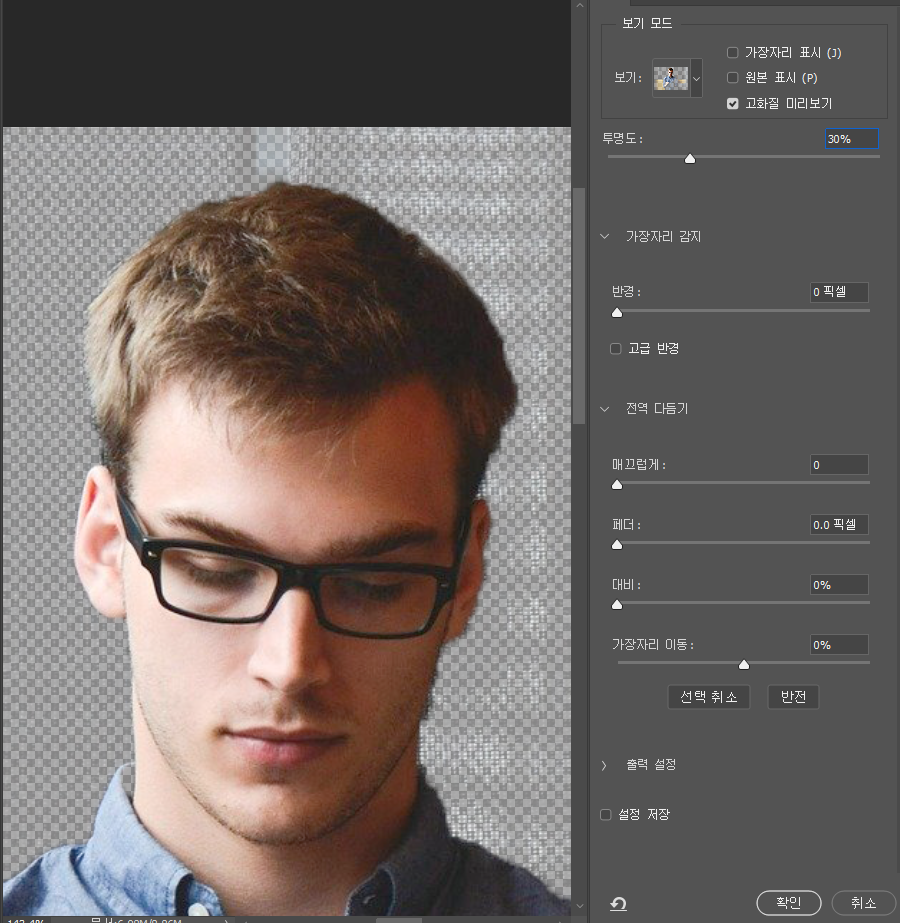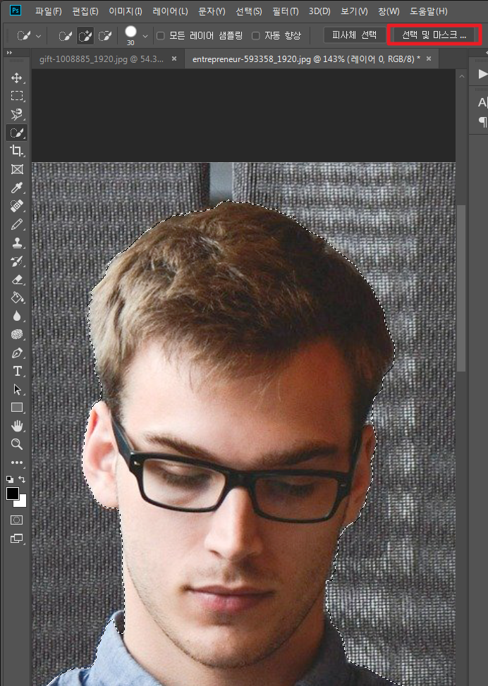 상단 설정에 선택 및 마스크를 클릭하여 주면 세부 조정 창이 나옵니다. (다른버전은 가장자리 다듬기(리파인 엣지)를 사용)