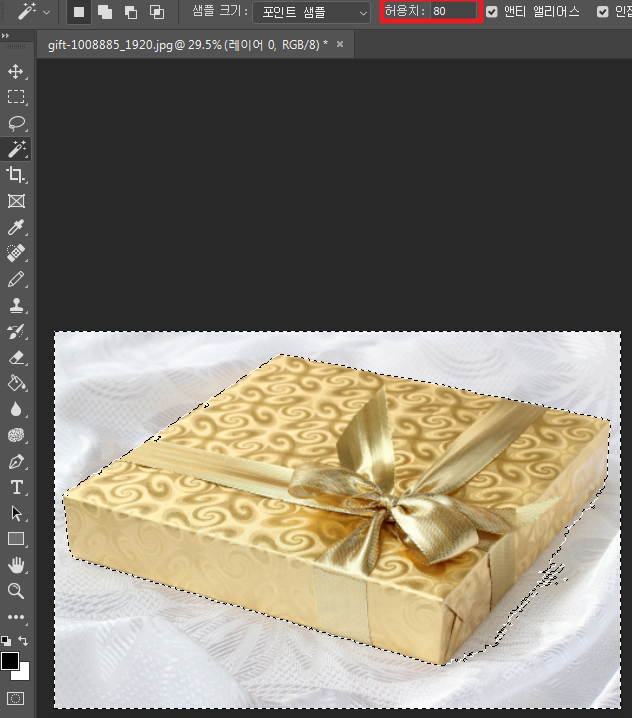 배경이 완벽한 단색이 아니라 중간에 잡아주지 못하는 곳이 있습니다.(단색이면 단번에 선택 해 줍니다.) 이럴 때는 상단의 도구 설정 패널에서 수치를 높여 주면 더 잘 잡아줍니다.