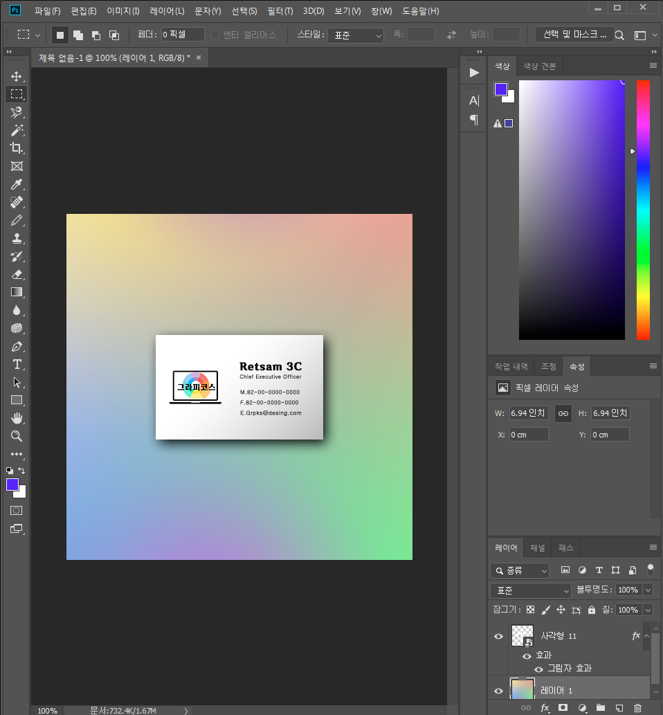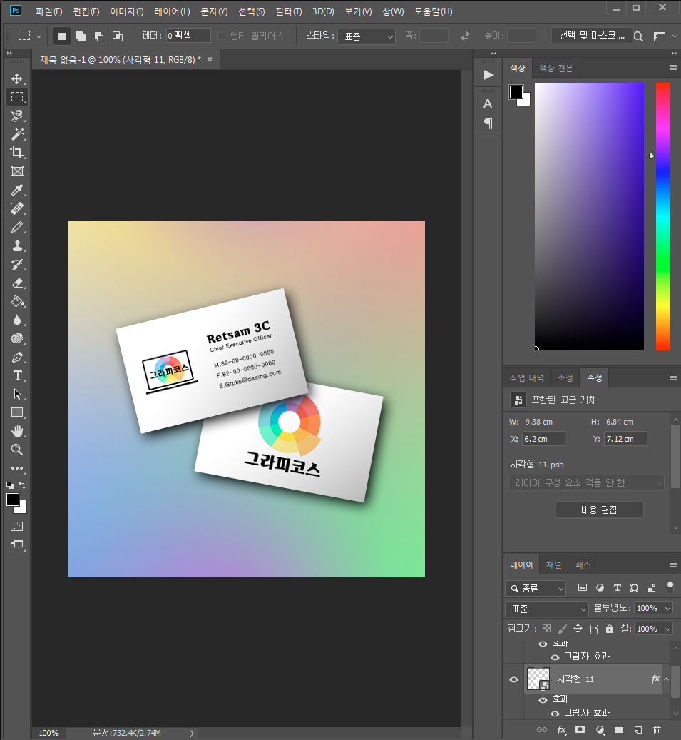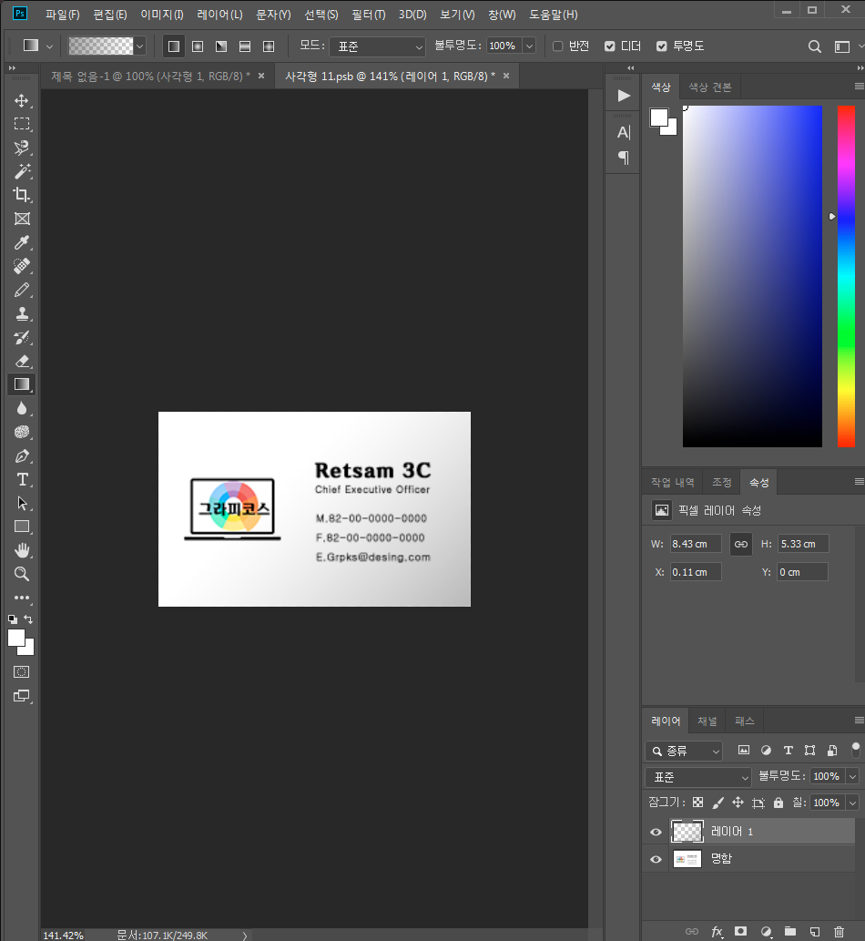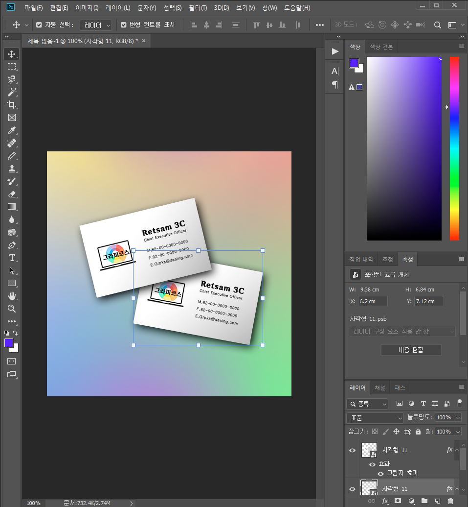 1-6. 디자인을 마무리합니다. 이동 도구로 명함 고급개체를 돌려 마음에 들게 배치합니다. 저는 뒷면을 추가 해보겠습니다.