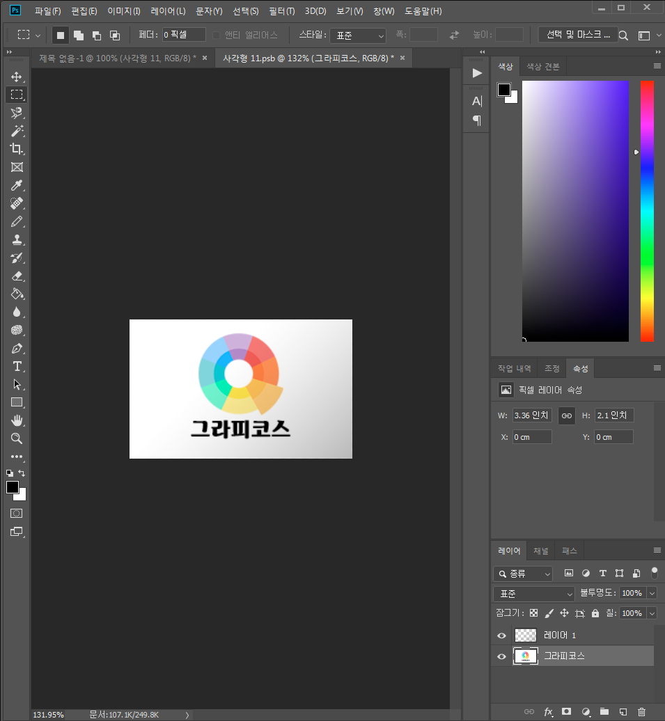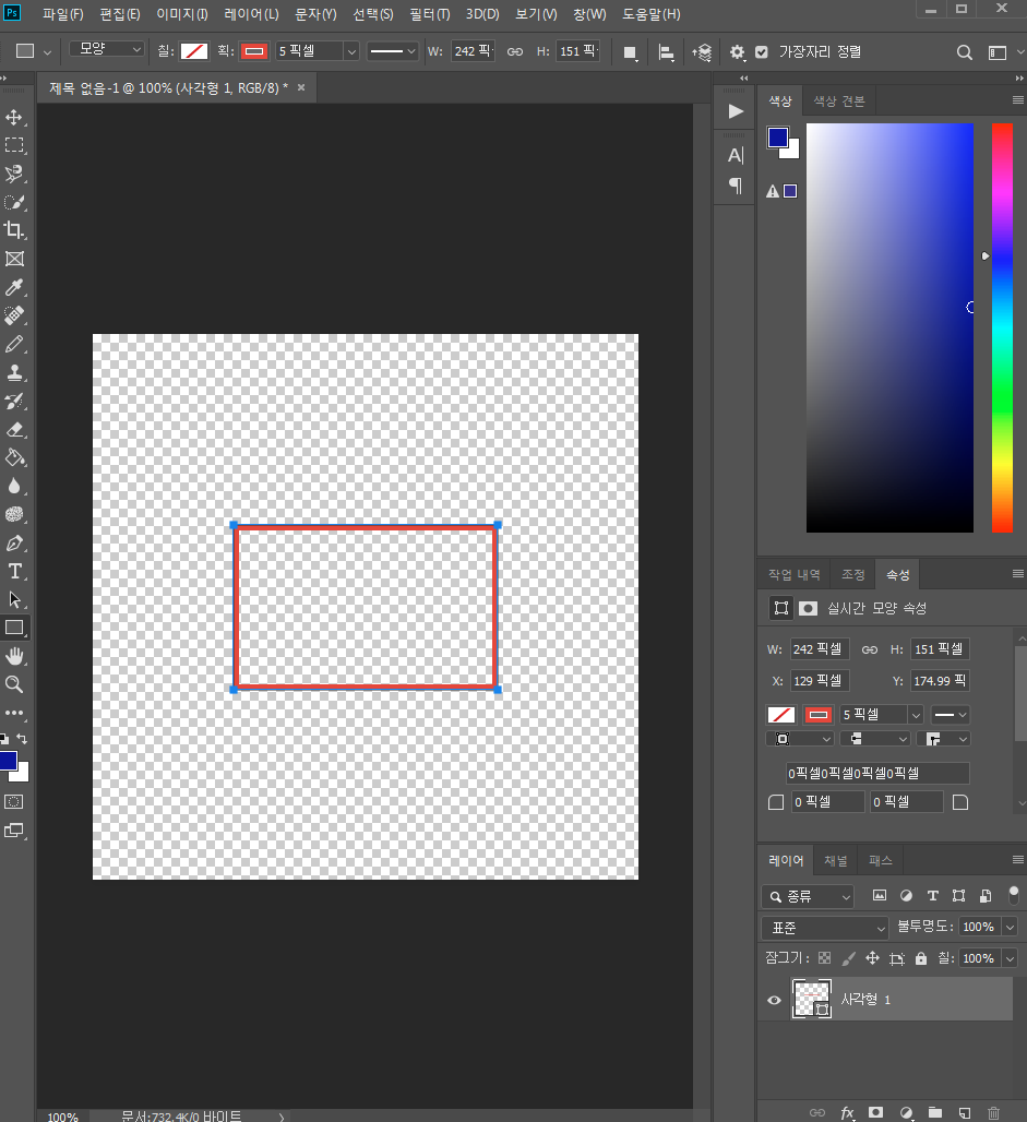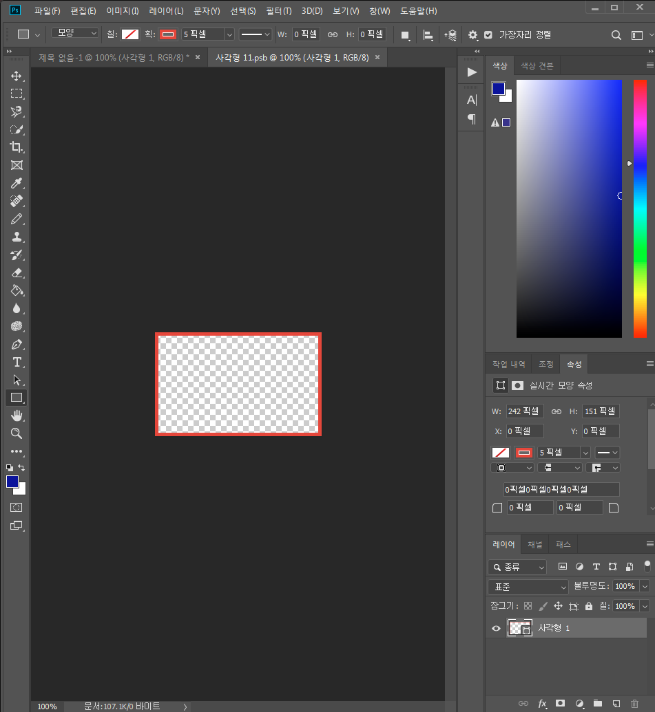 1-1. 사각형 도구로 명함이 될 사각형을 만듭니다. 명함의 사이즈는 90x50픽셀 사이즈를 많이 사용합니다. (86mm x 54mm가 표준)