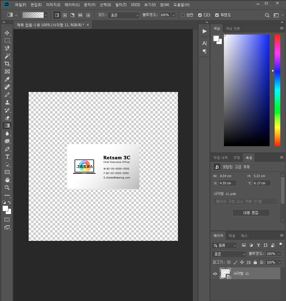 1-4. 명함 이미지를 넣고 레이어를 추가하여 그레이디언트로 명암을 넣어줍니다. 저장하고 목업이 될 탭으로 가면 명함이 잘 들어가 있습니다.