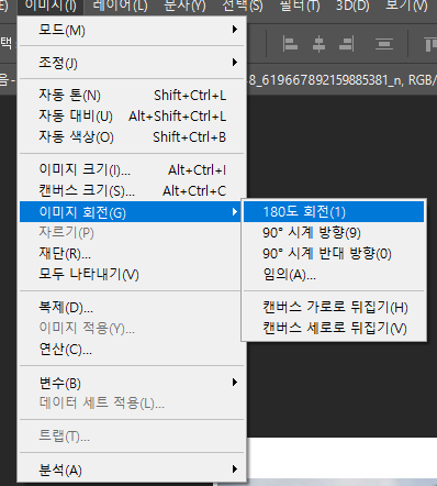 이미지(I) -> 이미지 회전을 클릭합니다.